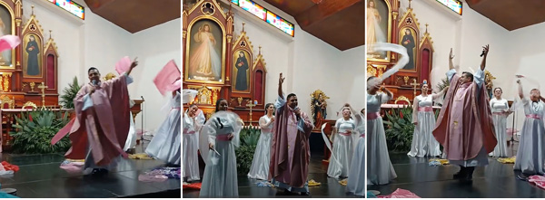 Fr. Chucho, as he is normally known, or Fr. Jesus Herman Orjuela, his official name, is a famous Pentecostal priest whose ministry is exercised in the Divine Mercy Sanctuary in Bogota, Colombia.His "solemn masses" are usually "animated" with dancing girls, above, who provide a backdrop for his songs. He also dances while he sings, as we can see in the gifs and photos on this page, which were taken from this video of his Mass on March 30, 2025.