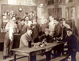 In a simple French cafe of the 1930s, drinks are served in proper glasses |