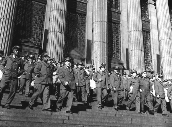 Above you see a group of mailmen leaving the General Post Office in the early morning to start their delivery rounds in New York City on a normal day in 1955. They all walk erect, revealing a prior disciplinary training; they stride down the stairs with the decision of men who want to carry out their duties, revealing the seriousness of their commitment and the efficiency of their service.