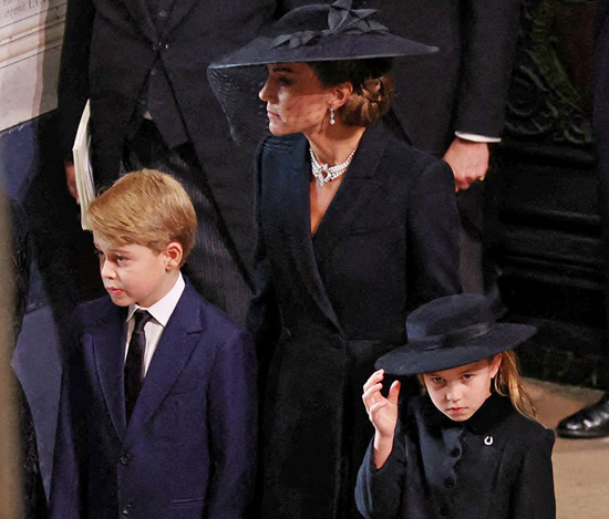 Above we see Princess Charlotte of Wales, appropriately dressed in full black mourning attire at the funeral of her great-grandmother Queen Elisabeth II. Prominently displayed on the left side of her coat is a horseshoe diamond and pearl brooch, a gift to the Princess from the late Queen, who had a great fondness for all things equestrian.The brooch originally belonged to the Queen Mother – see first row below – who gave it to her daughter, Queen Elizabeth, before her death. The Queen in turn gave it to her great-granddaughter, Princess Charlotte.