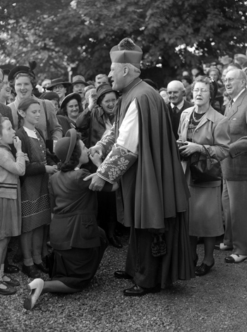 A woman enjoys showing respect to Rev. Cushing in Boston, 1949