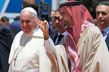 A smiling Francis promenades with Muslim leaders during his visit to the Holy Land