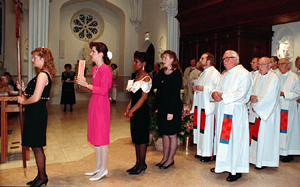 Before the Mass, women in sleeveless dresses bring the sacred objects to the altar preceding the priests and religious, a role that until now was reserved for male servers in ceremonial vestments |