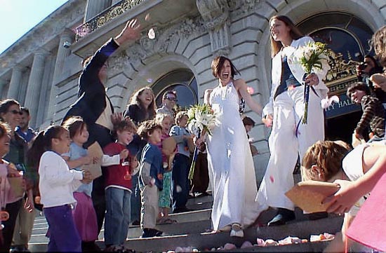 The San Francisco Chronicle ran this photo on October 11, 2008, showing first-grade students from a local public grade school celebrating their teacher’s lesbian “wedding.” The Chronicle reports: “The 18 Creative Arts Charter School students took a Muni bus and walked a block at noon to toss rose petals and blow bubbles on their just-married teacher Erin Carder and her ‘wife’ Kerri McCoy, giggling and squealing as they mobbed their teacher with hugs.”