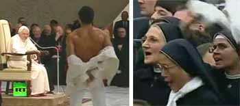 On December 15, 2010 in the Paul VI Hall at the Vatican, a scandalous carnival-type act was performed by male acrobatics for Pope Ratzinger and various Prelates. Some 6,000 guests were in attendance, including nuns old and young. The unrestrained delight in their faces was captured on film.