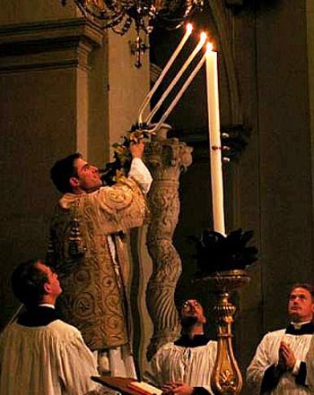 As the procession of clergy advanced into the church, the three candles were lit successively to honor each Person of the Holy Trinity; at each lighting the deacon sang the three-fold