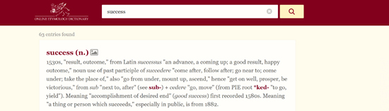 Success. 1530s, “result, outcome,” from Latin successus “an advance, a coming up; a good result, happy outcome,” noun use of past participle of succedere, “come after, follow after; go near to; come under; take the place of,” also “go from under, mount up, ascend,” hence “get on well, prosper, be victorious,” from sub “next to, after” (see sub) + cedere “go, move” (from PIE root *ked- “to go, yield”). Meaning “accomplishment of desired end” (good success) first recorded 1580s. Meaning “a thing or person which succeeds,” especially in public, gis from 1882.