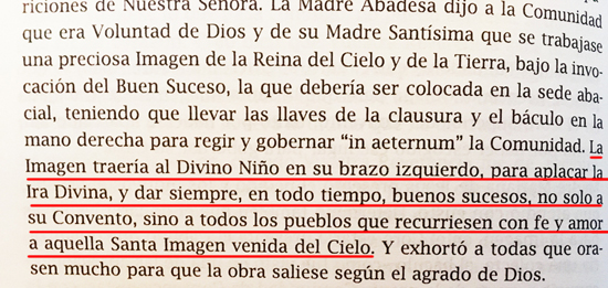 The Spanish original reproduced below reads: “La Imagen traería al Divino Nino en su brazo izuierdo, para aplacar la Ira Divina, y dar siempre, en todo tiempo, buenos sucesos, no solo a su Convento, sino a todos los pueblos que recurriesen con fe y amor a aquella Santa Imagen venida del Cielo.” (Fundacion Jesús de la Misericordia, vol.II, p. 54)