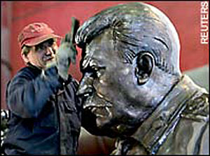 Above, working on a new monument to the tyrant Stalin. Below, Churchill, Roosevelt and Stalin will be placed in the old Stalingrad square (today, Volgograd) - News.telegraph online, May 4, 2005