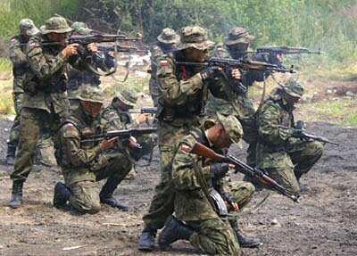 Above, Russian troops ready to invade; below, Polish soldiers preparing to defend their country