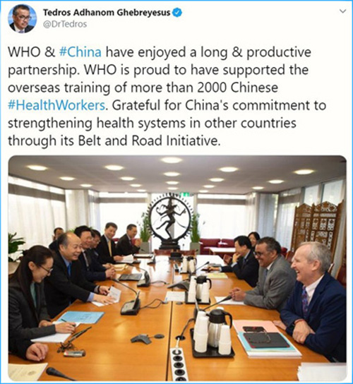 WHO director-general Tedros Ghebreyesus with the General Secretary of the Communist Party of China Xi Jinping