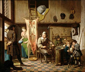 A cobbler with his family is at ease serving a magistrate |