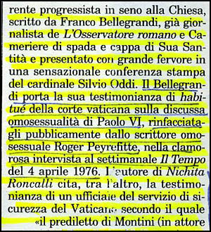 Bellegrandi, a habitué of the Vatican palace, offers his personal testimony about the discussed homosexuality of Paul VI, which was publicly divulged by the homosexual writer Roger Peyrefitte in a clamorous interview with the weekly Il Tempo on April 4, 1976.