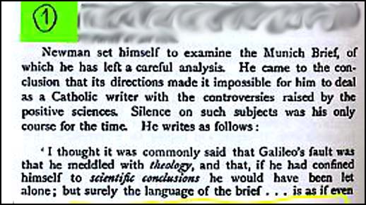 Further, Newman issued a critique of Pius IX's Brief that concluded by describing the papal document as an "intimidation to every religious man," and he declared that forced by it, he would temporarily cease writing on these issues. This is the first photocopy (1) reproduced below from The Life of Cardinal Newman (vol. 1, pp. 566-567).