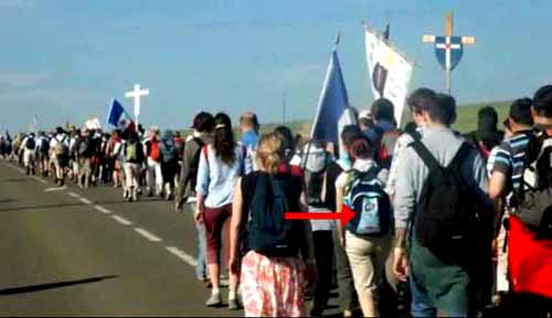 It is also noteworthy the complete lack of order in their march and their shoddy clothes. Not to say that women and men loungeing on the ground in their shorts cannot inspire pure thoughts. In brief, it seems to me there is not much difference between these so-called traditionalists and the youth who attend WYDs. By the way, in the photo you can check out a girl in the group carrying a WYD bag [see red arrow].