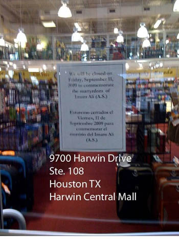 Harwin Central Mall: The very first store that you come to when you walk from the lobby of the building into the shopping area. It had this sign posted on their door. The shop is run by Muslims.