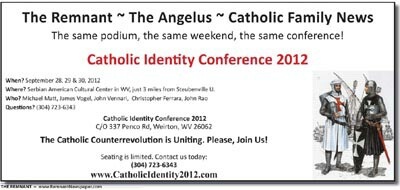 Another initiative that raised indignation in me was the joint promotion of a conference called the “2012 Catholic Identify Conference” by The Remnant, Angelus Press and others who pretend to be the authentic representatives of the Counter-Revolution. I wonder what “Catholic identity” will be defined in this conference when we know that the two mentioned organizations are compromised by increasingly supporting Vatican II, the New Mass, silencing resistance against progressivist Bishops and conciliar Popes, etc.