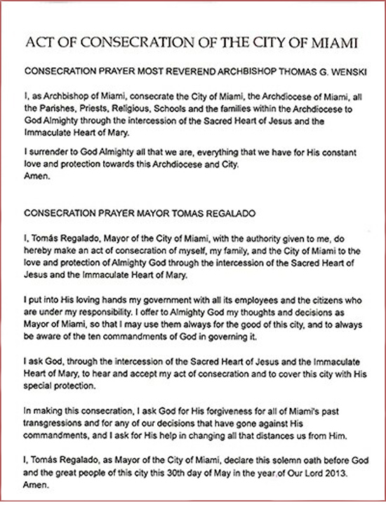 I want you and your readers to know that Miami was officially consecrated to the Sacred Heart of Jesus and the Immaculate Heart of Mary on May 30, 2013.
