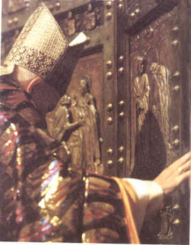 "This year John Paul chose special colors to highlight the uniqueness of the bi-millennial Jubilee. On Christmas Eve, he wore a holy mantle the likes of which had never before been seen in St. Peter's! Its colors were flashy blues, reds, and golds - representing the Temple of Jerusalem, according to Vatican sources."