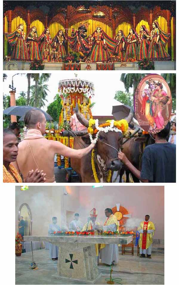 Below first row, Catholic girls performing an aroti dance before entering Nagari's new church. Second row, Hindu girls offering flowers to Krishna at the Sri Gaura festival, 2009.