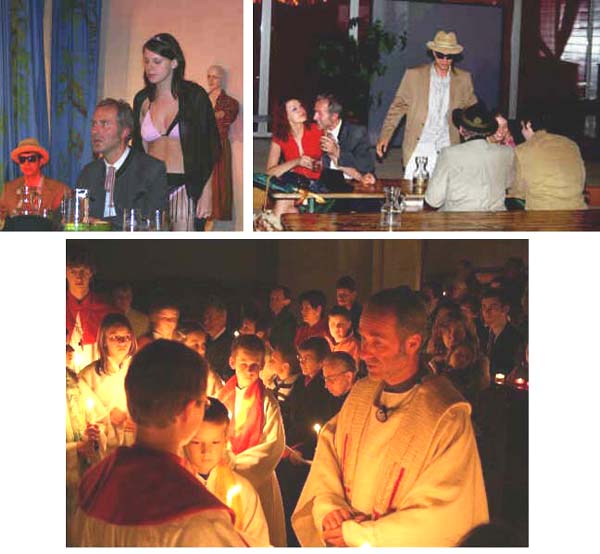 Fr. Schlagnitweit is an amateur actor. Above he is performing in the play Tales from the Vienna Woods by Odon von Horvath. It is amazing to see in his various performances the lack of modesty of this priest, who should be a model of good customs for his parishioners and students. It is needless to say that Bishop Ludwig Schwarz of Linz has full knowledge of Fr. Schlagnitweit's artistic activities and approves them. Below, first row, two other shots from the same show where the actor-priest appears in immoral poses with women.
