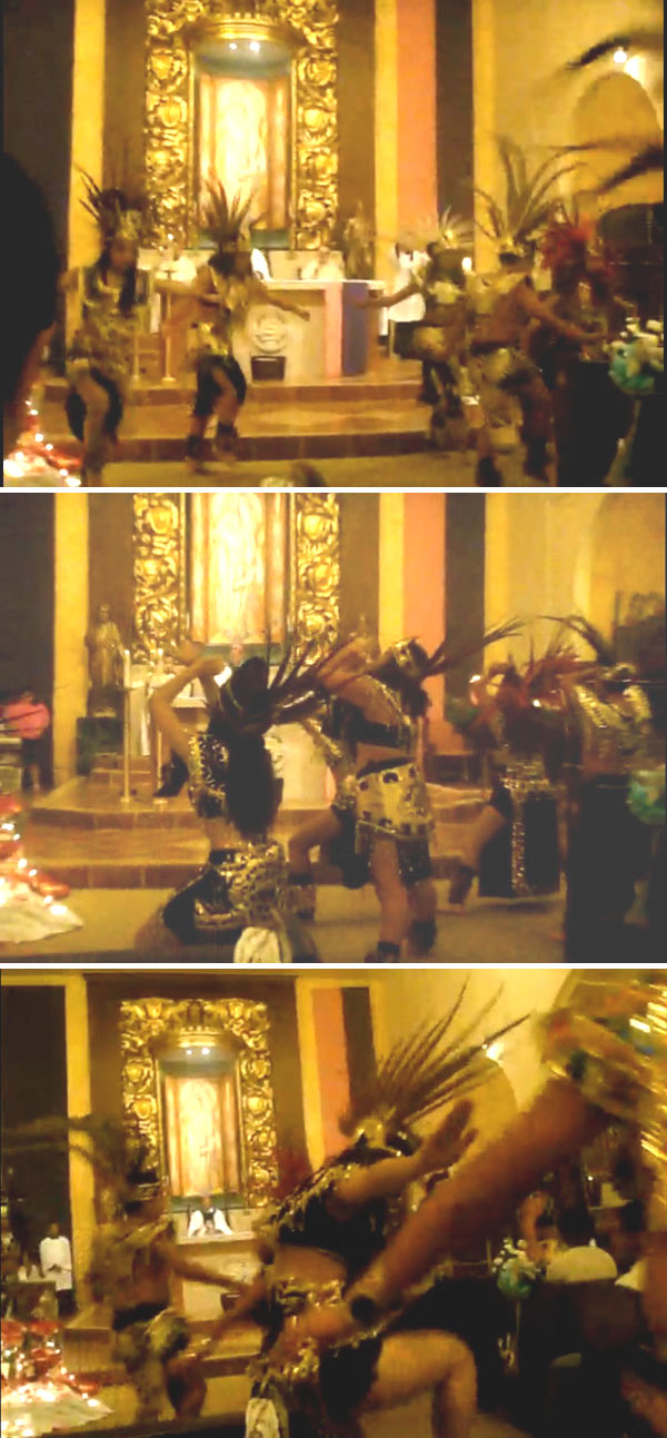On this page you see photos of a leg & belly show under the pretext of performing Aztec Dances. It took place at the Cathedral Chapel of St. Vibiana, downtown Los Angeles, on December 12, 2009, the feast of Our Lady of Guadalupe, and was executed by the Flor de Mayo Aztec Ballet Folklorico.We are not discussing whether a folkloric presentation of this type is appropriate in itself. Our point is that it is gravely unfitting for such a show to take place in a Catholic Church before the Altar, with the Blessed Sacrament present in the Tabernacle. It is a profanation that Catholics should reject and make reparation for.