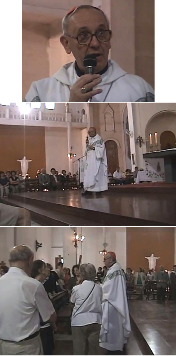 Card. Bergoglio presided over this performance from a place of honor in the church, shown above by the arrow. Below last three rows, you see some shots of Bergoglio at the same Mass during his sermon and giving Communion.