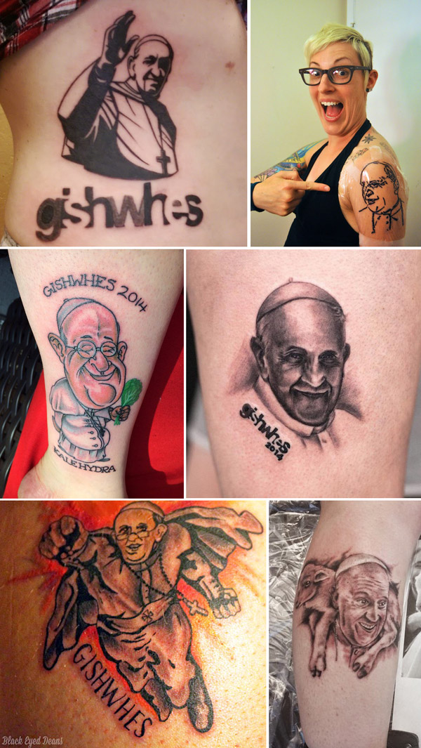The rising wave of destruction Pope Francis has promoted in the institutions and doctrines of the Catholic Church has raised the admirations of countless Freemasons, Communists, Jews and heretics from the most diverse azimuths among the enemies of Catholicism.Now, he is adding to this balance the admiration of punks, who are making him an idol for their tattoos. Either spontaneously or stimulated by media competitions (GISHWHES), it is becoming the fashion for punks, hippies and homosexuals to display profiles and portraits of Francis – their great buddy – on their bodies.