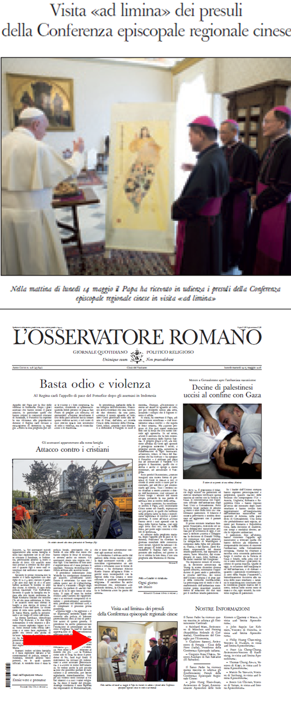 The May 24, 2018 issue of L'Osservatore Romano, the Vatican newspaper, published on its front page a photo-spread of Sheshan Sanctuary, above left, one of the main churches held by the Catholic Patriotic Association (CPA), the Chinese organization controlled by the communist government.At the end of a general audience Pope Francis directed these words to the Chinese pilgrims who were present there: