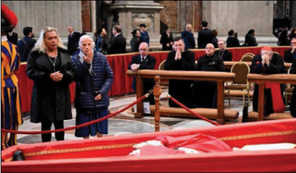 At left in the photo above, we notice a long-haired person in a black dress alongside an old woman with a dark blue jacket viewing Francis's body exposed at St. Peter Basilica on Friday, April 25, 2025. They are in the area reserved for V.I.P. viewers.The person in black is a male prostitute who underwent surgery to "become a woman," and is one of the group of Argentinian prostitutes who live and work in the beach city Torvajanica, 23 miles from Rome.