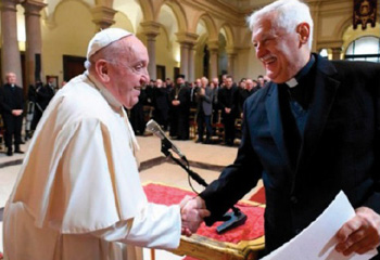 Pope Francis giving a Masonic handshake to Fr. Arturo Sosa, General of the Jesuits