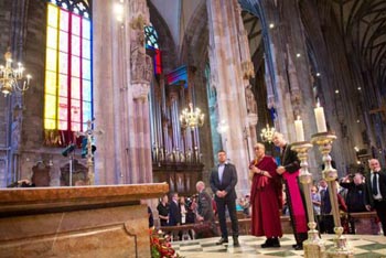 After the Mass, the Cardinal of Vienna and the Dalai Lama sat down amiably not to discuss doctrine, but to seek common points. They discussed various aspects of “monastic life” that the Dominicans (Schonborn’s Order) and Buddhists have in common, silence and a life of meditation. Then they commented on their shared concern for the “lost generation in Europe” and the meanings of faith that could offer these youth a solution. (2)